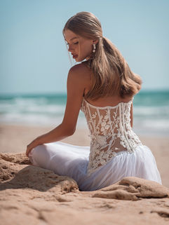 A strapless Basque waist gown with a multi-layered silk tulle skirt and a super-rich corset, that wraps the torso up to the waist. The corset is covered with an all-over handcrafted 3D flower lace and embroidery.